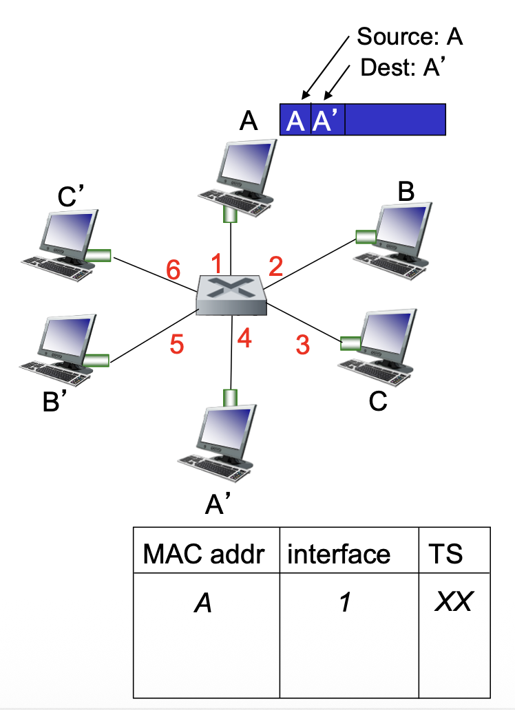 - 帧过滤:只向目的端口发送帧,不像集线器那样广播;